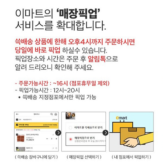 SSG닷컴 ‘매장픽업 서비스’ 베타테스트 시작SSG닷컴이 온라인에서 주문하고 집 근처 이마트에서 상품을 찾아갈 수 있는 ‘클릭 앤 콜렉트(Click & Collect)’ 형태의 비대면 픽업 서비스를 시범 운영한다.