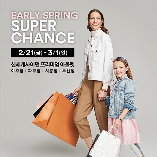 신세계사이먼 프리미엄 아울렛, ‘얼리 스프링 수퍼 찬스’ 개최신세계사이먼 프리미엄 아울렛이 2월 21일(금)부터 3월 1일(일)까지 ‘얼리 스프링 수퍼 찬스’를 개최한다. 이번 프로모션은 여주, 파주, 시흥, 부산 프리미엄 아울렛 전 점포 동시 개최되며 최초 정상가 대비 최고 80%를 할인한다.