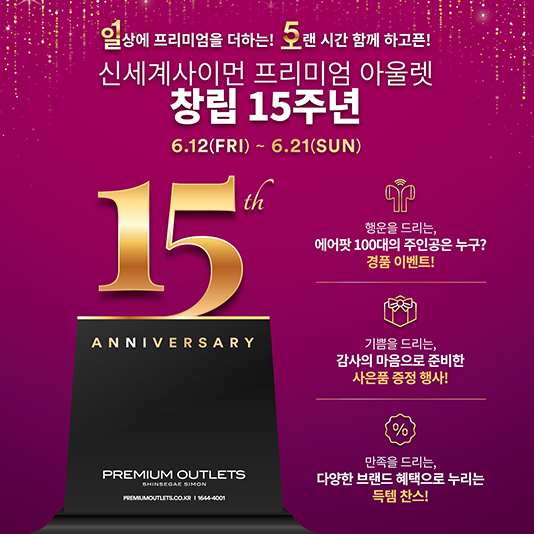 신세계사이먼 ‘창립 15주년 기념 프로모션’ 개최고객의 사랑과 지역사회의 성원으로 성장해 온 신세계사이먼은 이에 보답하고자 ‘창립 15주년 기념 프로모션’에서 다양한 행사를 진행한다. 이와 함께 신세계사이먼 프리미엄 아울렛 전 점포에서는 300개의 브랜드가 참여하여 할인혜택을 제공한다.