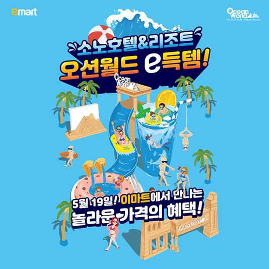 이마트, 워터파크 시즌이 돌아왔다 이마트X소노호텔앤리조트와 손잡고 숙박권, 워터파크 이용권 판매이마트가 리조트 업계 1위 소노호텔앤리조트와 손잡고 숙박권, 워터파크 이용권 판매에 나선다. 사회적 거리 두기 해제 후 처음 맞이하는 물놀이 시즌인 만큼 국내, 국외를 가리지 않고 여행수요가 폭발할 것으로 전망되는 가운데 이마트가 관광/숙박 업계와 연계한 프로모션을 진행한다.