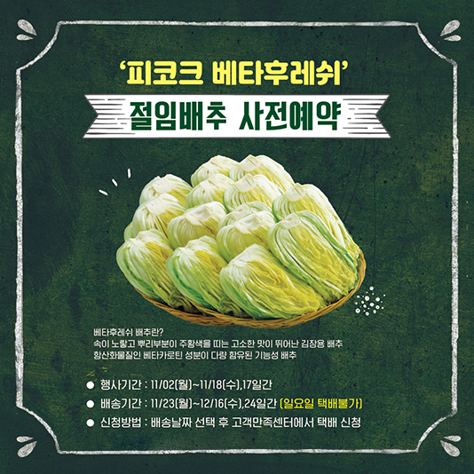 본격적인 김장철을 한달 앞두고, 이마트가 처음으로 프리미엄 배추인 ‘베타후레쉬 절임배추’ 사전예약 판매에 나선다. 이마트는 오는 11월 2일(월)부터 11월 18일(수)까지 17일간 프리미엄 배추인 ‘피코크 베타후레쉬 절임배추’ 사전예약 판매를 진행한다.
