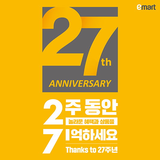 올해로 창립 27주년을 맞이하는 이마트가 11월 5일부터 2주간 코리아세일페스타를 겸한 대대적인 개점기념 행사를 실시한다. ‘쓱데이’를 통해 지난해 대비 2배가 넘는 매출 신장을 기록한 이마트는 개점기념 행사를 통해 ‘쓱데이’ 열풍을 이어가며 코리아세일페스타 활성화에 동참한다.