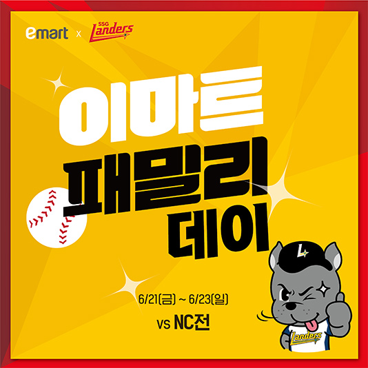 이마트, 6월 21일(금)부터 3일간 SSG랜더스와 ‘이마트 패밀리 데이’ 실시이마트는 SSG랜더스와 21일(금)부터 23일(일)까지 3일간 인천SSG랜더스필드에서 열리는 NC다이노스와의 주말 3연전을 맞아 ‘이마트 패밀리 데이’를 진행한다.