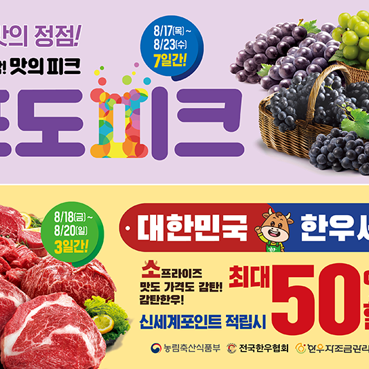 이마트 ‘소프라이즈ㆍ포도 피크’ 행사 진행이마트가 오는 8월 18일(금)부터 20일(일)까지 3일간 한우 품목별 대상으로 최대 50% 할인 행사를 진행하며 17일(목)부터 23일(수)까지 1주일간은 국산 제철포도 전품종 대상으로 32% 할인하는 포도피크 행사를 진행한다.