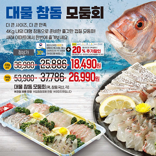 이마트가 1월 12일(금)부터 18일(목)까지 일주일간 4kg 내외 대형 참돔으로 만든 ‘국산 대물 참돔 모둠회’를 최대 반값 수준에 선보인다.