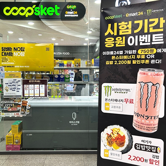 이마트24, 대학 내 10개 점포서 앱 가입 고객에게 에너지음료, 김밥 쏜다!이마트24는 이달 22일(월, 오늘)부터 매일 점심시간(오후 1시~2시)에 수도권 대학교 내 이마트24에서 ‘에너지드링크 무료 쿠폰’ 또는 ‘김밥 2200원 할인 쿠폰’ 중 1개를 선착순 증정한다. 쿠폰은 이마트24 모바일 앱 신규 가입하는 고객에게 제공된다.