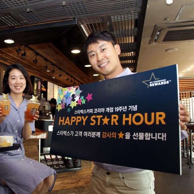스타벅스, 개점 19주년 기념 ‘해피 스타 아워’ 이벤트 전개스타벅스가 개점 19주년을 기념해 7월 19일부터 7월 23일까지 음료 한 잔당 최대 별 6개를 추가로 적립할 수 있는 ‘해피 스타 아워’ 이벤트