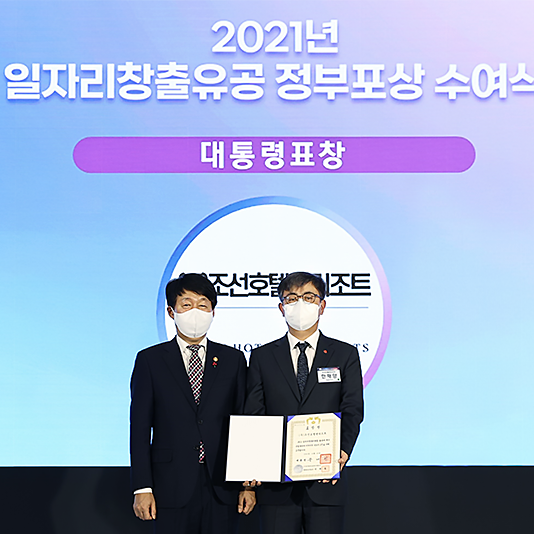 조선호텔앤리조트, ‘호텔 업계 유일’ 2021 일자리 창출 유공 정부 포상 대통령 표창 수상조선호텔앤리조트가 12월 23일(목) 정부세종컨벤션센터에서 진행된 ‘2021년 일자리창출 유공 정부포상 수여식’에서 일자리창출지원 부문 대통령 표창(단체)을 수상했다.