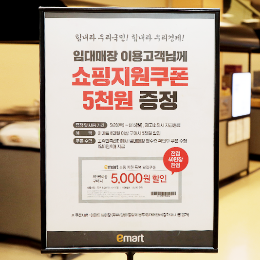이마트가 입점 임대매장을 이용한 고객에게 이마트 할인쿠폰을 지급한다. 구매 금액에 상관없이 임대매장 영수증을 고객만족 센터에 제시하면 쿠폰을 받을 수 있으며, 해당 쿠폰은 이마트에서 8만원 이상 구매 시 5천원을 할인해 주는 쿠폰이다.