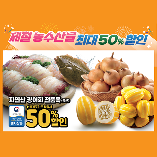 이마트가 오는 5월 10일(금)부터 16일(목)까지 제철 농수산물인 자연산 광어와 햇참외, 햇양파 등을 최대 50% 할인한다.
