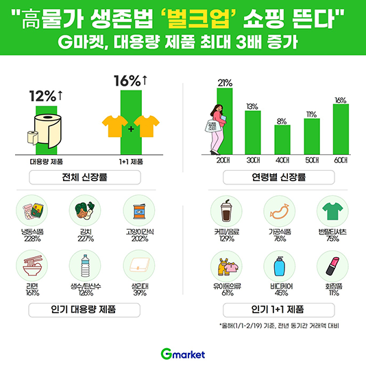 G마켓, “高물가 생존법 ‘벌크업’ 쇼핑 뜬다”…대용량제품 최대 3배 증가경기 불황과 고물가가 지속되면서 대용량으로 싸게 구매 후 두고두고 쓰는 이른바 ‘쟁여두기’ 소비가 확산되고 있다. 국내 대표 온라인 마켓플레이스 G마켓이 올해(1/1~2/19) 관련 상품군 거래액을 작년 동기간과 비교 분석한 결과, 대용량 제품은 전체 12%, 1+1 제품은 16% 각각 신장했다.