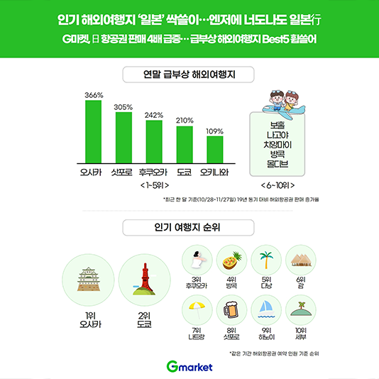 G마켓, 日 항공권 판매 최대 4배 급증… 연말 급부상 해외여행지 Best5 휩쓸어연말 해외여행지로 ‘일본’이 급부상하고 있다. 엔저 영향으로 경제적인데다, 지리적으로도 가까워 엔데믹 첫 해외여행지로 일본이 큰 인기를 누리고 있다.