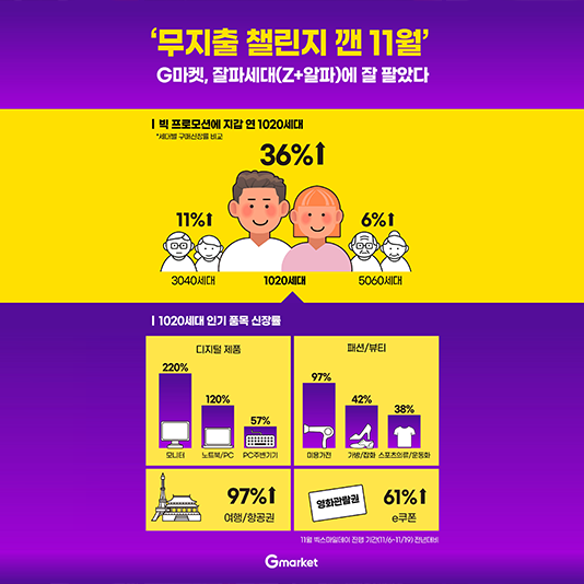 ‘무지출 챌린지 깬 11월 빅세일’… G마켓, 잘파세대(Z+알파)에 잘 팔았다강력한 할인과 라이브방송, 100원딜 등 연중 최대 혜택을 제공하는 11월 온라인 쇼핑 축제에 1020세대도 대거 동참한 것으로 나타났다. 고물가와 맞물려 ‘무지출 챌린지’가 유행하는 등 그동안 소비에 인색했던 ‘잘파세대’(Z세대+알파세대) 역시 대대적인 할인행사에서는 과감하게 지갑을 연 것.