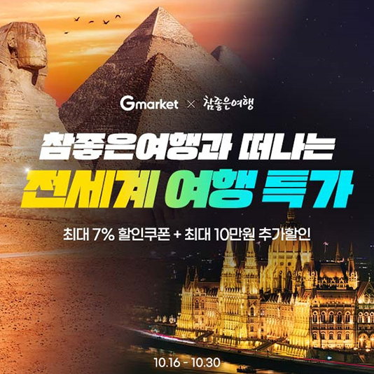 G마켓, 전세계 여행 상품 10% 할인…’참좋은여행 특가전’국내 대표 온라인 마켓플레이스 G마켓과 옥션이 오는 30일까지 ‘전 세계 여행 특가’ 프로모션을 진행한다. ‘참좋은여행’의 600여개 해외여행 상품을 10% 할인가에 쇼핑할 수 있는 기회다.