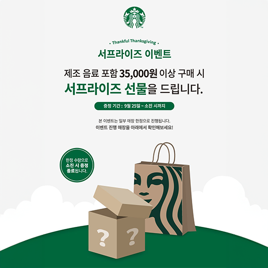 스타벅스, 추석 맞이 서프라이즈 선물 증정 이벤트 진행스타벅스 코리아(대표이사 손정현)가 9월 25일부터 민족의 명절인 추석을 맞아 스타벅스를 방문하는 고객들에게 서프라이즈 선물 증정 이벤트를 선보인다.