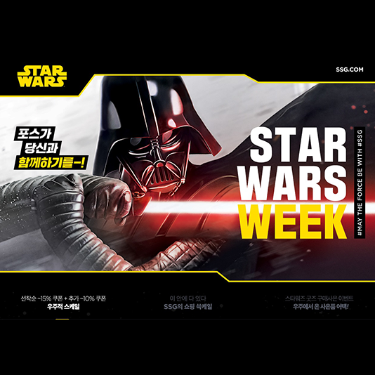 SSG닷컴은 오는 16일까지 2주 간 ‘스타워즈 위크’를 열고 스타워즈 단독 기획 상품을 비롯해 패션, 완구, 식품 등 다양한 품목을 최대 80%까지 할인한다고 3일 밝혔다.