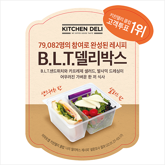 이마트, 고객이 가장 원하는 샐러드, 샌드위치 조합은? 7만 9천여명 고객 투표로 탄생한 ‘B.L.T. 델리박스’ 출시이마트 키친델리가 7만 9천여명의 고객 투표로 탄생한 신상품을 선보인다. 이마트 키친델리는 17일(일)부터 베이컨과 신선한 상추, 토마토가 어우러진 ‘B.L.T. 샌드위치’와 상큼한 ‘카프레제 샐러드’, ‘발사믹 드레싱’을 함께 담은 ‘B.L.T. 델리박스(5,980원)’를 이마트 전점에서 본격 판매에 나선다.
