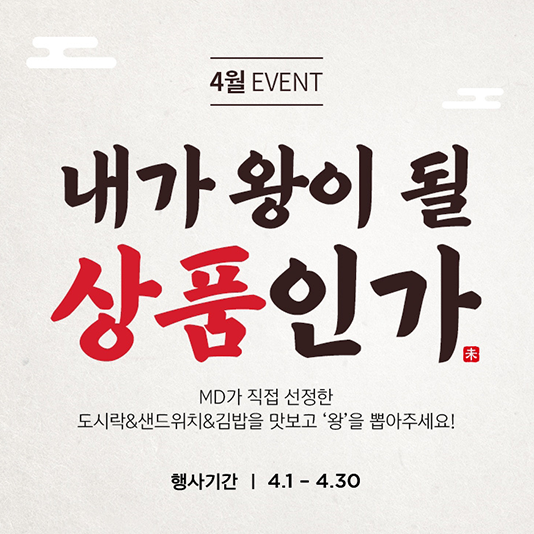이마트24, 4월 FF 상품왕 가린다!이마트24가 가장 맛있는 프레시푸드 상품을 뽑는 이색 이벤트를 4월 한달간 진행한다. FF 상품왕 후보는 총 10품목으로 구성으며, FF 상품왕으로 선정된 상품에 1위 스티커를 부착해 5월 각 매장에서 판매할 예정이다.