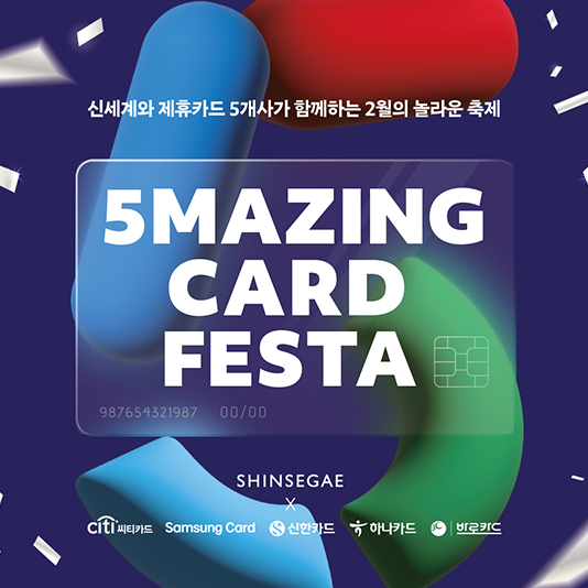 신세계백화점, 제휴카드 5개사 혜택 모아 ‘5메이징 카드 페스타’ 연다신세계백화점이 제휴카드 5개사와 손잡고 풍성한 혜택을 선보인다. 업계에서 가장 많은 제휴카드로 고객들에게 맞춤형 혜택을 제공하고 있는 신세계백화점이 이번엔 모든 제휴카드 혜택을 한데 모아 고객들에게 특별한 쇼핑 혜택을 선사하는 것이다.