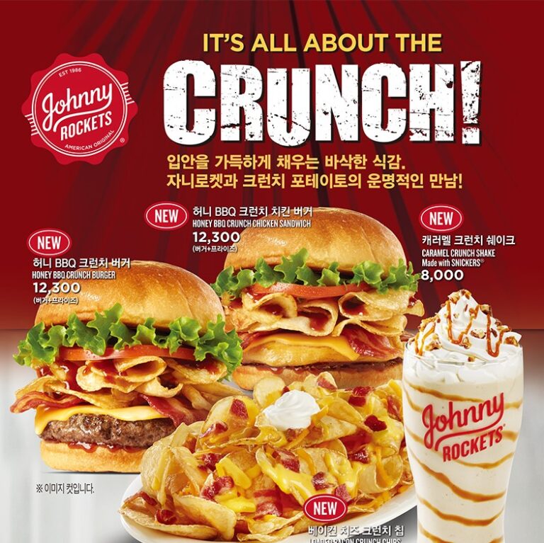 ‘자니로켓(Johnny Rockets)’이 바삭한 식감을 극대화한 ‘허니BBQ 크런치 버거’, ‘베이컨 치즈 크런치 칩’ 등 신메뉴 4종을 출시했다.