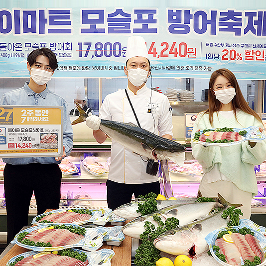 이마트, 27주년 기념 ‘모슬포 방어회’ 반값 수준 판매이마트가 창립 27주년을 맞아 해양수산부와 함께 제철 방어회를 작년 반값 수준에 선보인다. 이마트는 11월 12일(목)부터 일주일간 제철 맞은 방어회를 신세계포인트 회원 인증 시 20% 할인된 1만4,240원에 판매한다