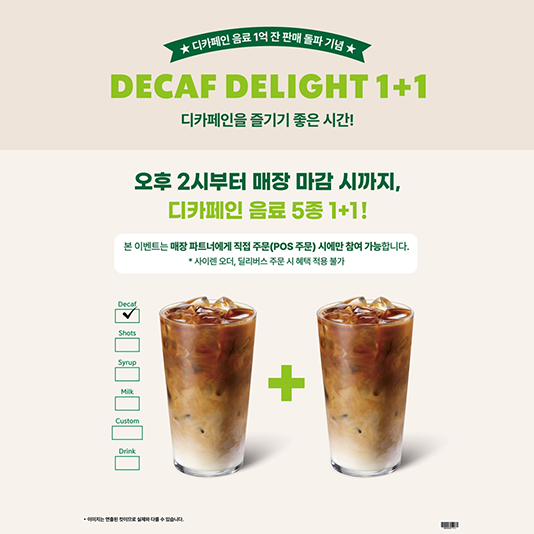 헬시 플레저 바람 타고 디카페인 커피 1억 잔! 스타벅스, 오후 2시부터 디카페인 1+1스타벅스 코리아(대표이사 손정현)가 디카페인 커피 누적 판매량 1억 잔 돌파를 기념해 디카페인 커피 1+1 이벤트를 진행한다고 2일 밝혔다.