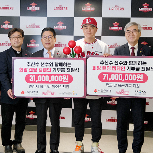 SSG랜더스의 추신수 선수가 ‘희망 랜딩’ 캠페인을 통해 적립한 기부금 총 1억 2백만 원을 취약계층 군인들과 인천시 학교 밖 청소년들에게 전달했다.