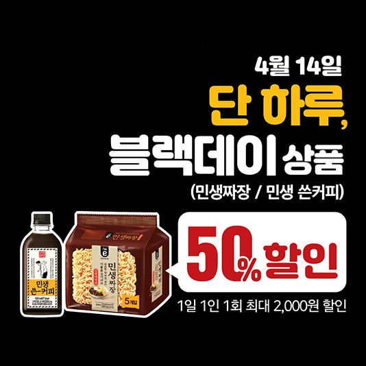 이마트24, 블랙데이 단 하루! 민생짜장라면 개당 160원 꼴, 민생쓴커피 600원!이마트24가 4월 14일 ‘블랙데이’를 맞아, 민생짜장라면과 민생쓴커피 대상으로 파격 할인 이벤트를 진행한다. 이마트24는 블랙데이를 맞아, 민생짜장라면을 22일까지 번들(5입, 3200원) 구매 시, 1번들을 추가로 제공하는 ‘1+1이벤트’를 진행한다.