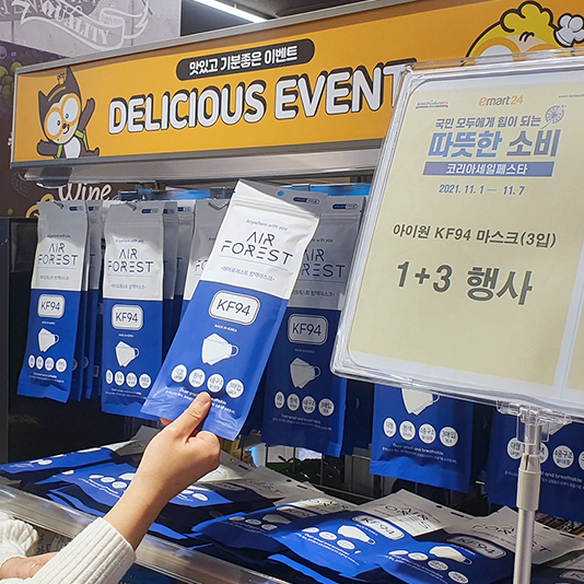 이마트24가 쓱데이에서 이어지는 코리아세일페스타(이하 코세페)로 쉴 틈 없이 할인 혜택을 제공한다. 먼저 이마트24는 11월 1일~7일까지 ‘아이원 에어포레스트 방역마스크(KF94, 3입)’를 1+3으로 판매한다. 1개 구매 시 3개를 덤으로 제공하는 파격적인 이벤트로, 날씨가 추워지면서 KF94마스크를 찾는 고객이 늘어남에 따라 코세페를 맞아 이 같은 이벤트를 마련했다. 이후 8일부터는 말일까지는 50% 할인된 가격으로 판매하며, 케이제이 3중 필터마스크 소형(10입)은 11월 한 달간 1+2, 비말차단마스크(KF-AD)는 1+1로 판매한다. 또, 1일~7일까지 인기 도시락 3종(새우고추잡채&불고기덮밥, 한돈불고기 비빔밥, 뉴트로치킨마요 덮밥), 파스타 2종(돈까스&아라비아따, 소시지나폴리탄) 등 총 5종에 대해 구매 시 컵라면+생수(500ml)를 모두 제공하는 더블 증정 이벤트도 진행한다.