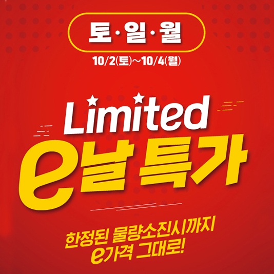 10월 2일(토)부터 4일(월)까지 3일간은 ‘e날 특가’ 행사를 열고, 1+1 증정 및 최대 50% 할인 행사도 진행한다. 먼저 ‘샤인머스캣 대축제’를 열고 샤인머스캣을 행사카드로 구매 시 최대 5천원 할인한다. 한층 쌀쌀해진 가을날씨를 맞아 립밤, 핸드크림, 바디로숀 등 보습용품도 최대 40% 가격행사를 진행하며, 하기스, 마미포코, 에코센 기저귀를 2개 구매시 50% 할인하는 등 베이비 위크도 연다.
