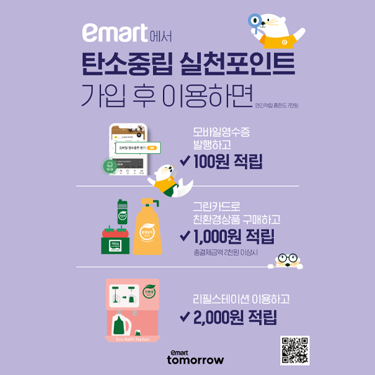 이마트, ‘탄소적립 실천포인트’ 자동 적립 시스템 오픈환경부, 한국환경공단과 기업이 함께 참여하는 ‘탄소중립 실천 포인트제’가 많은 관심을 받는 가운데 본격적으로 포인트 적립 활동이 활성화될 전망이다. 이마트는 오는 5월 23일부터 이마트에서 탄소중립 실천을 실행하면 자동으로 포인트가 적립되는 시스템을 오픈한다고 밝혔다.