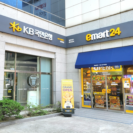 이마트24, 이마트24 X KB국민은행 디지털뱅크 결합매장 오픈!이마트24와 KB국민은행은 이달 23일(월) 편의점과 디지털뱅크가 결합된 금융 전문 편의점 1호점을 오픈한다. 충정북도 청주시 분평동에 오픈하는 이마트24 금융 전문 편의점 1호점은 20여평의 편의점과 10여평의 KB디지털뱅크가 연결된 매장으로, 편의점에서 상품 구매를 하면서 은행 업무까지 한 번에 해결할 수 있는 신개념 하이브리드 매장이다.
