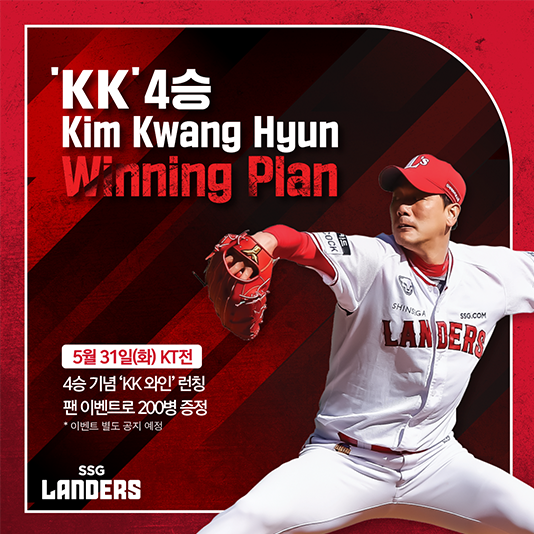 SSG랜더스, 김광현 시즌 4승 달성에 따른 ‘KK Winning Plan 4단계’ 실시SSG랜더스(대표이사 민경삼, 이하 SSG)의 김광현 선수가 지난 3일(화) 한화전에서 7이닝 1실점으로 시즌 4승을 달성함에 따라 ‘KK 위닝 플랜’ 4단계를 진행한다.