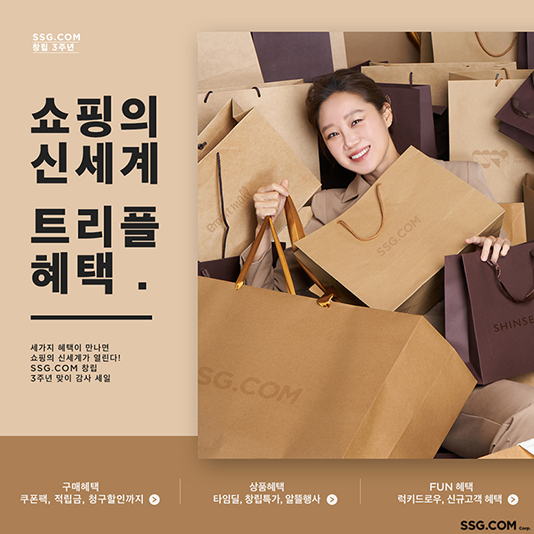 SSG닷컴, 창립 3주년 맞아 ‘쇼핑의 신세계-트리플 혜택’ 행사SSG닷컴이 창립 3주년을 기념해 고객에게 다양한 혜택과 특가 상품을 제공하고 함께 즐길 수 있는 콘텐츠를 선보이는 대형 행사를 실시한다.