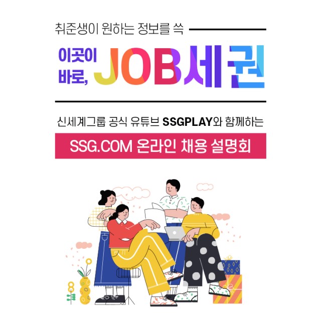SSG닷컴, 온라인 채용 설명회 연다SSGPLAY는 오는 5일(토) 오후 2시부터 1시간 동안 ‘SSG닷컴 신입사원 채용 설명회’를 열어 다양한 채용 정보를 전달할 예정이다.
