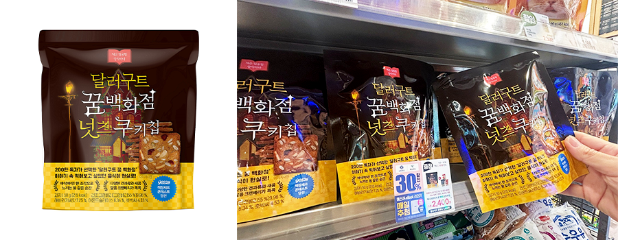 이마트24가 이달 5일부터 판매하는 ‘달러구트 꿈 백화점 넛츠쿠키칩(2,300원)’은 바삭한 쿠키칩 안에 아몬드, 해바라기씨를 넣어 고소함을 더하고, 크랜베리로 새콤함까지 더한 상품이다. 특히 책을 읽는 고객들이 손에 묻히지 않고, 한입에 간편하게 먹을 수 있도록 개발했다. 또 ‘달러구트 꿈 백화점’ 도서의 디자인과 라벨지를 패키지에 위트 있게 담아냈다.