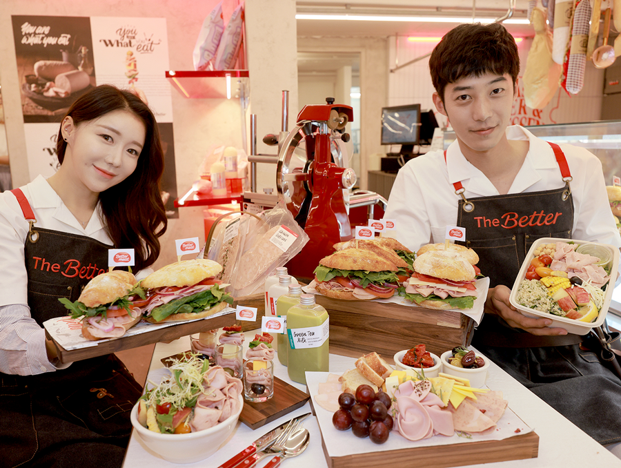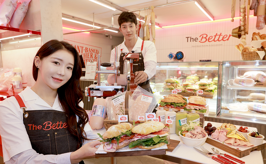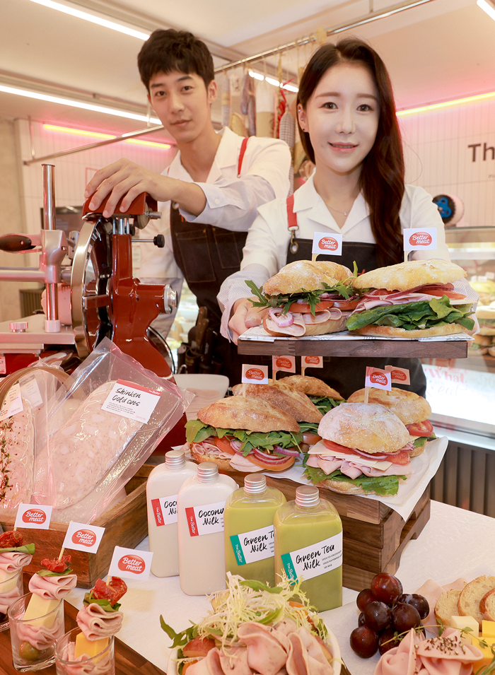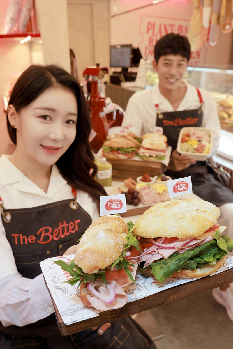 사진설명 : 14일 서울 강남구 압구정 로데오거리에 신세계푸드가 국내 최초로 오픈한 식물성 정육 델리 ‘더 베러(The Better)’에서 모델들이 미트 슬라이서(Meat slicer, 육절기)로 썰어 만든 대체육 메뉴를 소개하고 있다. ‘더 베러’는 신세계푸드가 대체육 ‘베러미트’로 만든 샌드위치, 샐러드를 비롯해 대체식품을 활용해 만든 50여 종의 메뉴를 유러피안 뉴트로 스타일의 매장에서 경험할 수 있도록 만든 팝업스토어다. 신세계푸드는 ‘더 베러’를 통해 소비자에게 대체육에 대한 긍정적인 경험을 제공할 뿐 아니라 ‘인류건강’, ‘동물복지’, ‘지구환경’ 등 사회적 가치를 알린다는 목표다.