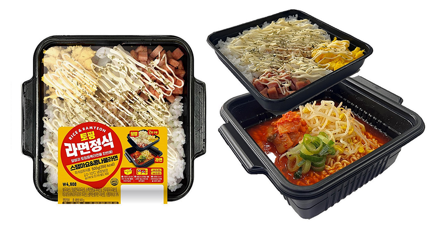 토핑라면정식은 2단으로 된 용기에 1단은 라면, 2단은 밥으로 구성되어 있는 도시락이다. 라면 용기에 표시선까지 뜨거운 물을 붓고 밥과 함께 전자레인지에 2분 30초만 조리하면 라면과 밥을 맛있게 즐길 수 있다.