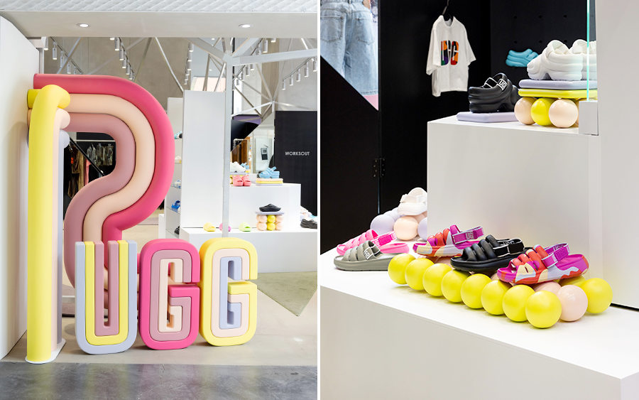매장 인테리어는 ‘어우 예’의 곡선 모양과 다채로운 색감에서 영감을 얻어 어그만의 색다른 매장 분위기를 완성했다. 또 매장 곳곳에 공 모양의 알록달록한 소품과 샌들 모양의 LED 패널을 설치해 인증샷을 남길 수 있는 공간도 마련했다.