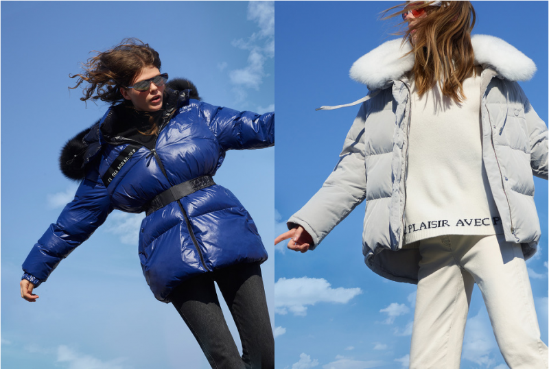 그 중에서도 짧고 경쾌한 기장의 ‘글로시 벨티드 퍼 구스다운 패딩’은 탈부착 가능한 풍성한 폭스퍼가 후드에 달려있어 다양한 연출이 가능한 제품이다. 광택이 도는 블루 색상과 소매와 가슴 부분의 레터링 그래픽으로 포인트를 줬으며, 내장된 벨트를 매면 여성스러운 복장에, 벨트를 빼면 캐주얼한 옷차림에 두루 활용할 수 있는 것이 특징이다.