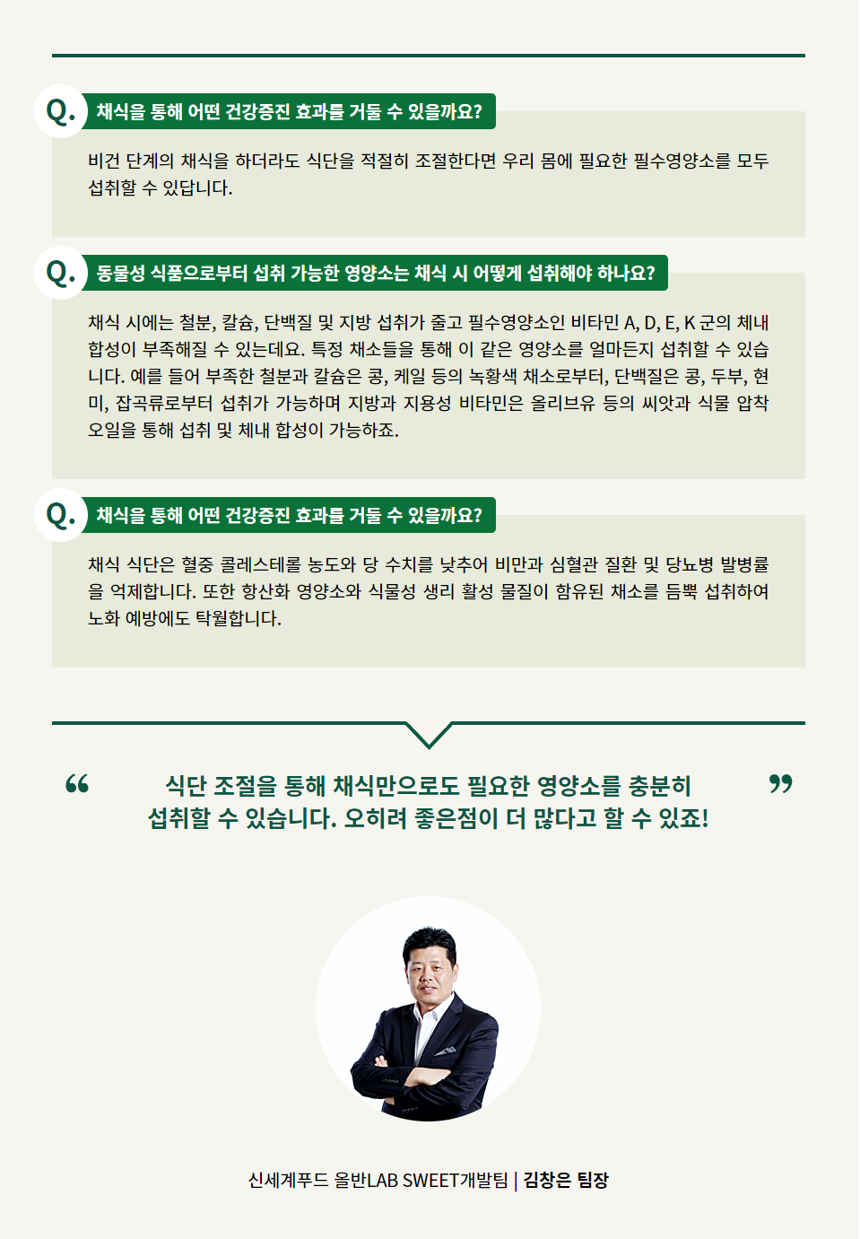 우리 몸을 구성하는 영양소는 참으로 다양합니다. 그중 반드시 음식물로부터 섭취가 가능한 필수영양소도 있는데요. 때문에 채식주의자라면 주변으로부터 이런 질문을 흔히 받고는 합니다. “식물성 식단이 위주인 채식, 과연 영양상의 문제는 없을까요?” 이에 대한 명쾌한 해답을 듣기 위해 건강한 비건 베이커리 레시피를 연구하는 신세계푸드 올반LAB SWEET개발팀 김창은 팀장을 만나봤습니다.