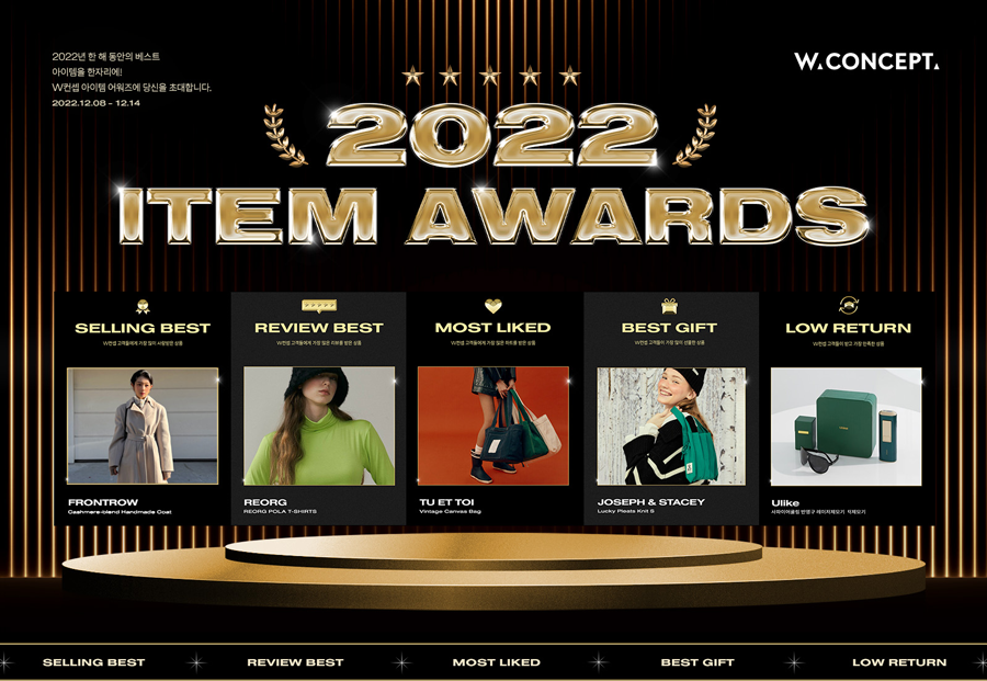 W컨셉은 8일부터 14일까지 ‘2022아이템 어워즈’를 열고 올 1월부터 11월까지 취합한 고객 구매 데이터를 바탕으로 올해 가장 인기가 높았던 6백여 개 상품을 소개한다고 8일 밝혔다. 이번 행사에서는 어워즈에 선정된 상품부터 후보군까지 다양한 상품을 확인할 수 있으며, 기존 노세일 정책을 고수해오던 상품들도 높은 할인가에 만나볼 수 있다는 점이 특징이다.
