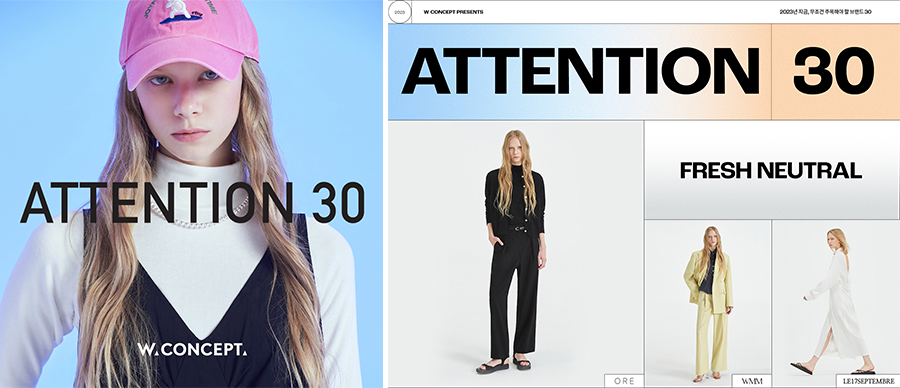어텐션 30 캠페인은 고객이 브랜드 무드와 이미지를 직관적으로 느낄 수 있도록 ‘프레시 뉴트럴’, ‘로맨틱 시크’, ‘영웨이브’ 등 3가지 키워드에 맞춰 소개하는 점이 특징이다. 또한, 브랜드 별로 핵심 아이템을 믹스매치해 W컨셉만의 차별화된 스타일링 노하우도 확인할 수 있다.