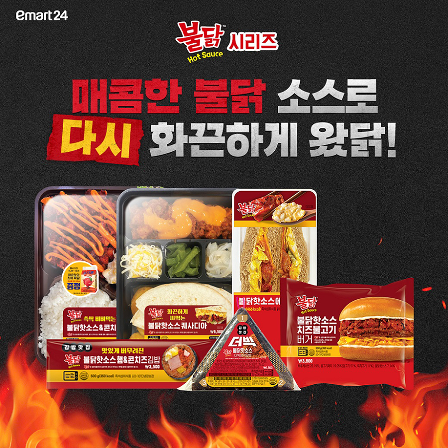 이마트24는 불닭소스를 활용한 햄버거, 김밥, 도시락 등을 선보여, 고객들이 다양한 형태로 매운 맛을 즐길 수 있도록 구성했다.
