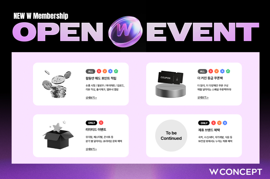 이달 말까지 초성 댓글 퀴즈 등 고객 참여 이벤트도 진행한다. 이벤트 참여 시 멤버십 등급별로 1명씩 총 4명을 추첨해 W컨셉 앱에서 현금처럼 사용할 수 있는 500만 포인트를 각각 지급한다. 이외에도 멤버십 개편 알림 페이지에만 방문해도 쇼핑에 활용할 수 있는 최대 7% 시크릿 쿠폰도 발급한다.