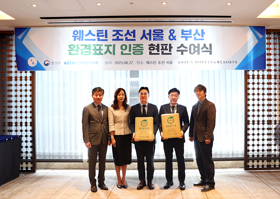 웨스틴 조선 서울과 웨스틴 조선 부산이 환경부 산하기관 ‘한국환경산업기술원’으로부터 ‘환경표지 호텔서비스 제품 인증서’를 취득하며 환경표지 수여식을 6월 27일(화) 오후 서울시 중구에 위치한 웨스틴 조선 서울에서 진행했다.