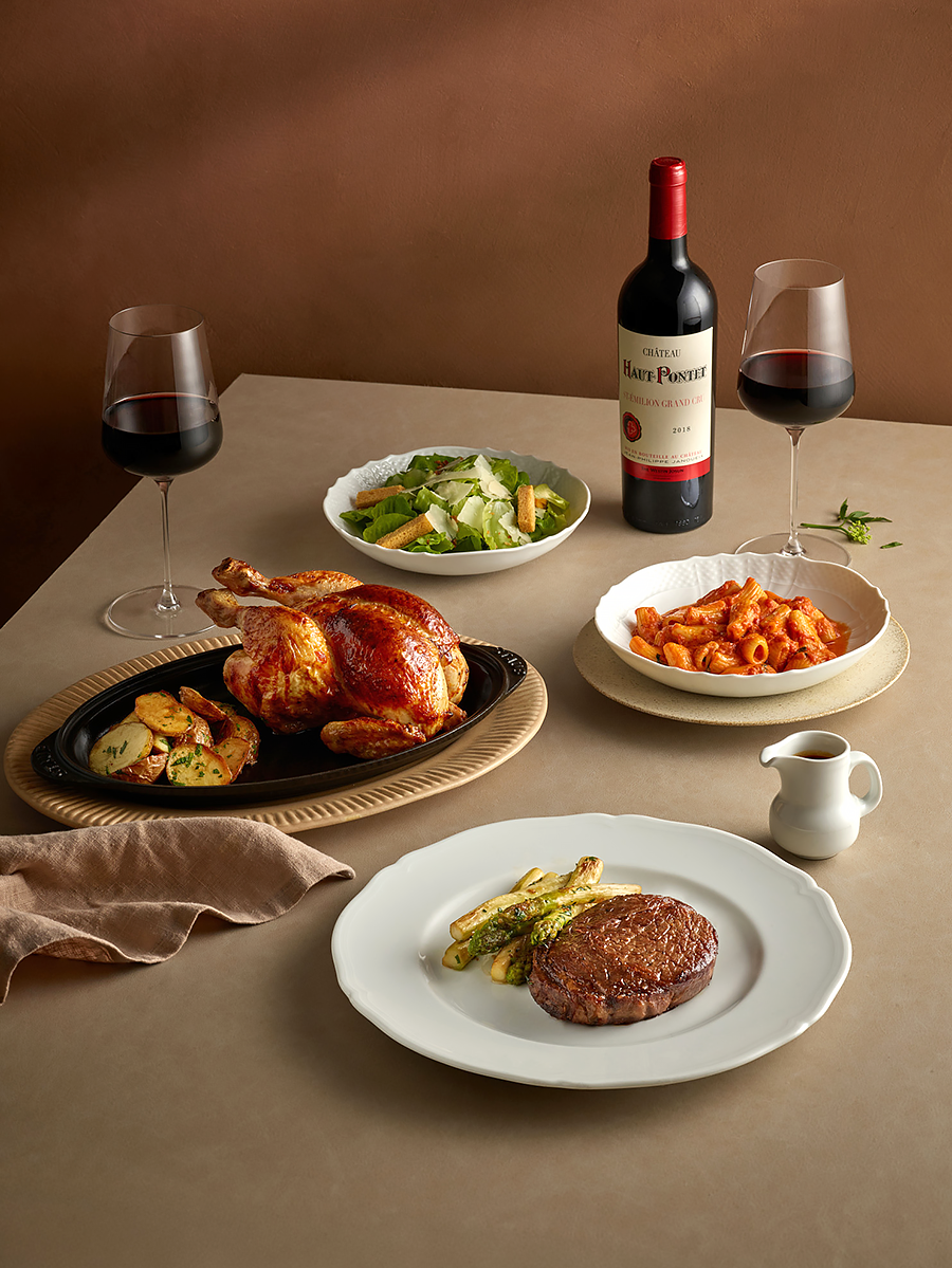 주말과 공휴일에 이용 가능한 해당 메뉴는 샤또 오 뽕떼 쌩떼밀리옹 그랑 크뤼 레드 와인 1병과 함께 4명이 다양하게 나눠먹을 수 있도록 나인스게이트의 시그니처 메뉴 4종이 준비된다. ‘시저 샐러드’와 ‘매콤한 토마토 소소의 생면 리가토니’, 촉촉하고 부드러운 속살의 ‘로스트 치킨’과 ‘한우 꽃등심 스테이크’가 제공돼 휴일의 여유를 즐길 수 있다. 가격은 35만원이다.