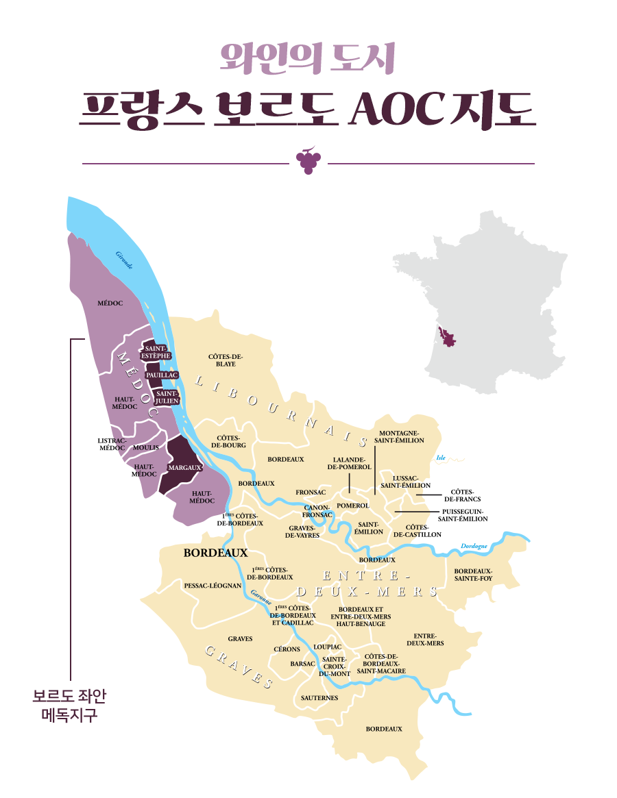 보르도 좌안, 메독 지역은 프랑스의 대표적인 와인 생산지입니다. 지형의 높낮이와 강물의 흐름에 따라 자갈밭부터 모래 지층까지 각각의 지층이 확연히 다른 곳이죠. 메독지역에는 대표적인 산지 네 곳이 있는데요. 지역에 따라 자연환경이 달라지듯 와인의 특징도 달라집니다. ‘마고(Margaux)’ 와인은 우아하고 섬세한 매력이 있고, ‘생쥴리앙(Saint-Julien)’은 미국 와인 같은 부드러움이 있으며, ‘뽀이약(Pauillac)’은 균형 잡힌 맛을 자랑하고, ‘생떼스테프(Saint-Estèphe)’는 거친 맛이 특징이죠. 그래서 저의 개인적인 견해로는 생쥴리앙의 딸보 와인을 좋아하신다면, 미국 와인도 좋아하실 거라 생각합니다.