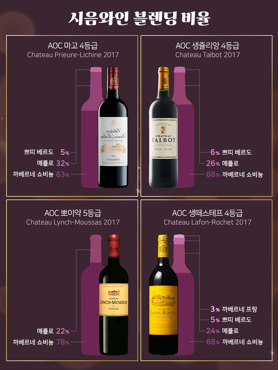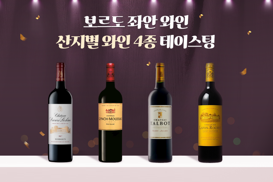 그렇다면 이번 시음의 주인공들은 각각 어떤 등급일까요? AOC 마고 프리외르 리쉰 4등급, AOC 생쥴리앙 4등급, AOC 생떼스테프 4등급, AOC 뽀이약 랭쉬 무싸 5등급입니다. 생각보다 낮죠? 그러나 등급이 낮다고 해서 와인의 퀄리티가 떨어지는 건 아닙니다. 1855년에 매겨진 등급으로 저평가되는 맛있는 와인들이 많습니다. 수많은 사람에게 사랑받는 ‘딸보’도 4등급이죠.