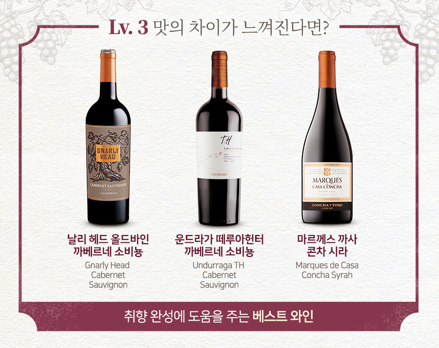 이 레벨에 오르시면, 지난 1, 2 단계의 와인들이 다소 입맛에 안 맞을 수 있습니다. 예민해진 혀로 맛의 차이를 본능적으로 느끼시는 분들에게 추천하는 와인입니다.